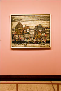 Moser garde sa palette "chamallow" pour un minimalisme coloré pour "Sommets", "Sommets de montagne et nuages" et Schiele tend vers l'abstraction avec des arbres très dépouillés ("Petit arbre d'automne" et "Arbre d'automne dans le vent") et ses villages sans relief ("Stein sur le Danube") qui constituent autant de métaphores de la condition humaine.