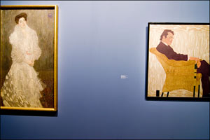 De mêm epour Moser qui conserve sa palette un peu mièvre notamment dans son "Autoportrait" mystique avec une expression hallucinée. Quant à Schiele, il peut peindre à la Klimt ("Portrait de Hans Massmann"), dans la continuité de ses autoportraits ("Portrait d'Arthur Roessler") ou de manière plus apaisée ("Portrait d'Edith Schiele").