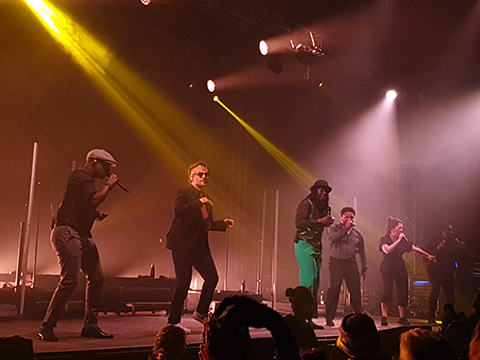 On retourne sous le chapiteau principal pour s’installer devant Faada Freddy. Tout comme le public qui a rempli le grand espace couvert, nous sommes émerveillés par ce que nous voyons et entendons : il n’y a aucun instrument sus scène, toute la musique est faite en beat box, body percussion et chant a capella, impressionnant ! Ça fonctionne très bien, ça ressemble à du gospel 2.0, qui irait picorer dans la world, la soul et un peu de reggae. C’est hyper entraînant et la voix chaude de Fadda Freddy se marie à merveille avec celle des choristes. Il est déchainé sur scène. Sa voix est puissante, il danse et harangue la foule. Outre la performance, il faut aussi souligner le visuel très accrocheur et le son absolument impeccable.