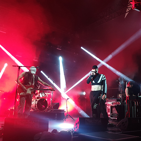 On enchaîne directement avec Vlure, grosse révélation de la soirée : le groupe de post-punk originaire de Glasgow met le feu à la scène avec son mélange de guitare saturée, nappes de synthé à la Depeche Mode et beats électroniques empruntés à la scène rave des années 90 : sacré cocktail auquel s’ajoute l’accent écossais à couper au couteau du chanteur, néanmoins fort sympathique et qui s’adresse à la foule en français. Un de leur chanson s’intitule "The Storm", et la recette de ce groupe est en effet détonante !