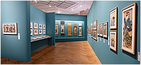 Celle-ci, avec des cimaises en camaïeu tonal en harmonie avec les lignes de force de l'esthétique japonaise, privilégie l'épure et la sobriété qui, nonobstant la modulation de l'accrochage, n'est pas vraiment en synergie avec le style exubérant et ludique de Kuniyoshi..